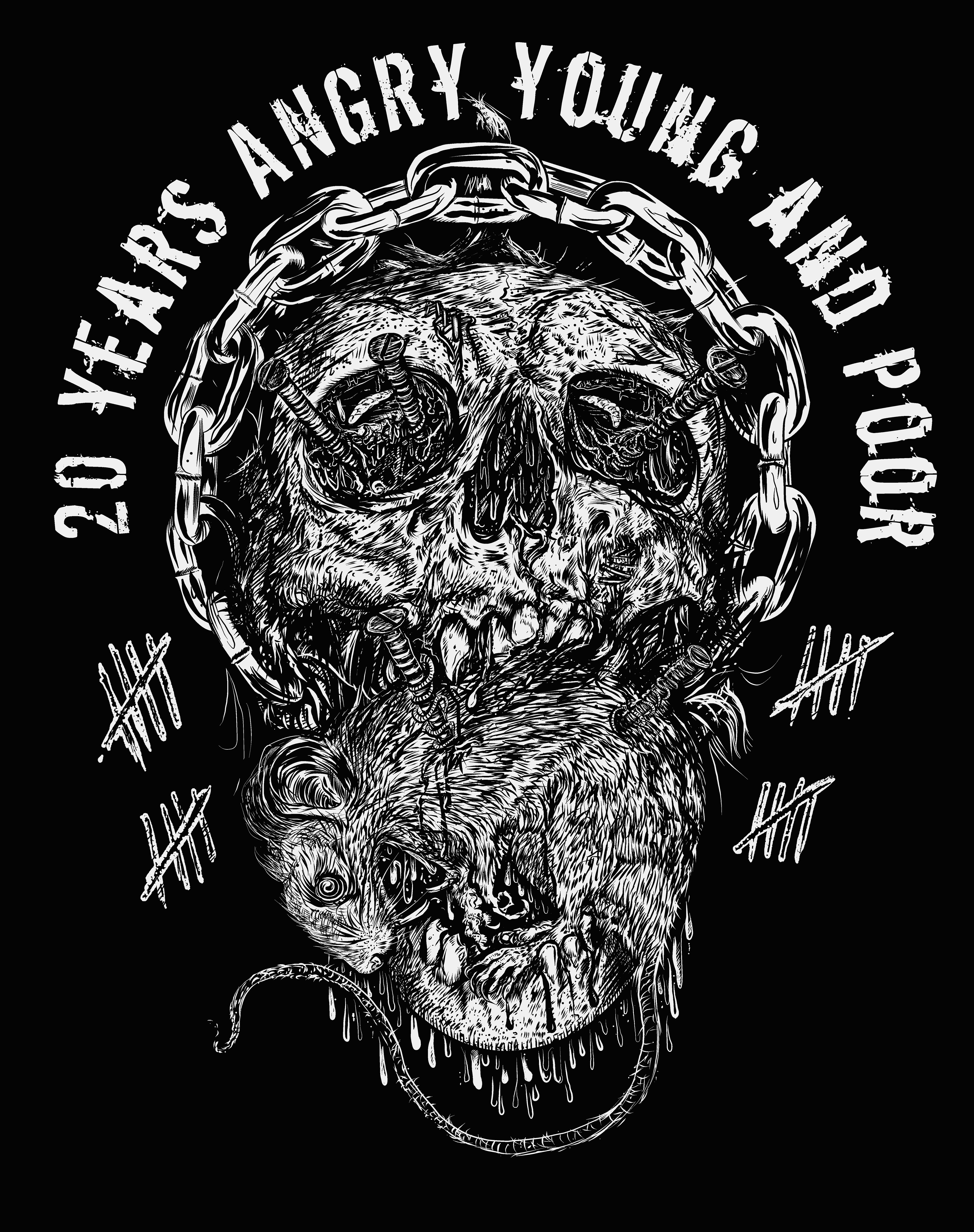 Illustration for online retailer Angry Young and Poor's 20 year anniversary tshirt design.